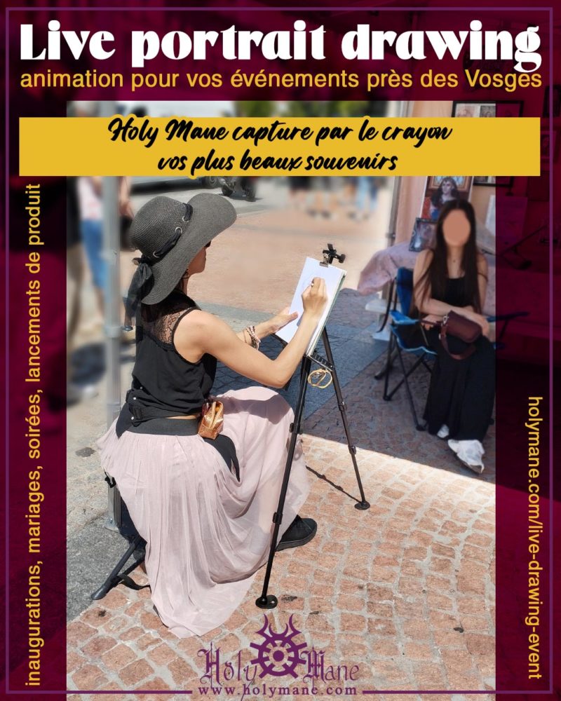 live drawing events,fr,You organize events,fr,inaugurations,fr,weddings,fr,chic evenings,fr,You are looking to distinguish yourself with original animations,fr,Offer your guests the presence of a portrait painter capturing the best memories of your events,fr,In a style that is both expressive and elegant, which is well suited to the world of fashion,fr,Holy Mane draws faces,fr,but also the outfits,fr,pencil and ink,fr,or in color,fr,markers or watercolor,fr,according to desires,fr,Pour,en,minutes per portrait,fr,Your guests leave with a personalized gift and a souvenir of your event,fr,Holy Mane travels to the Epinal sector,fr,until,fr,request the service quote by email or,fr,and contact,nl